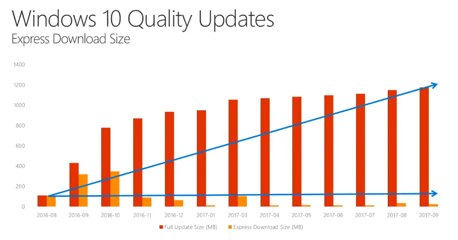 Express packages are a way to significant reduce the amount of data that each Cumulative Quality Update. The way these Express Updates work is that when a new update comes out, only the CAB file ”chunks” for components that need to be updated are downloaded to each client instead of the whole package, like a delta download. To is easiest to view in a graph.