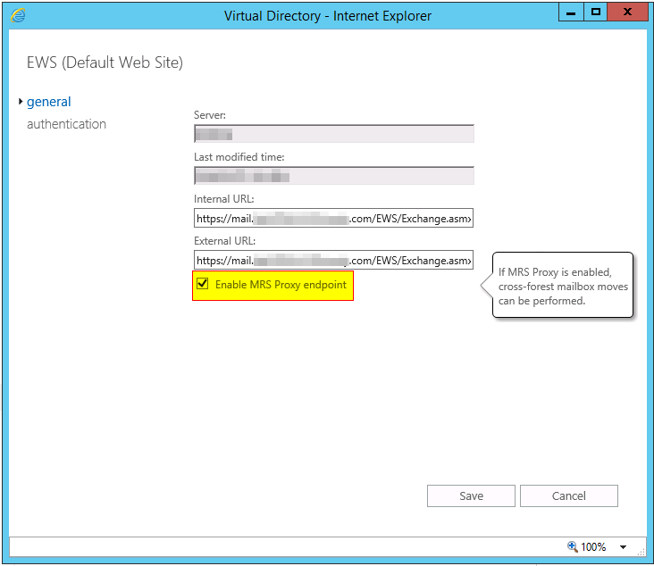 Going to the on-premise Exchange Admin Center, Servers > Virtual Directories > EWS (Default Web Site) I wanted to verify that MRS is enabled for that server – but as the picture shown below, it wasn’t.
