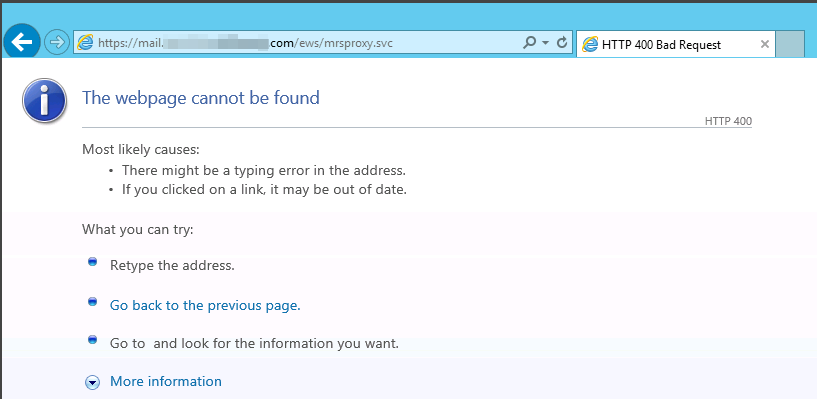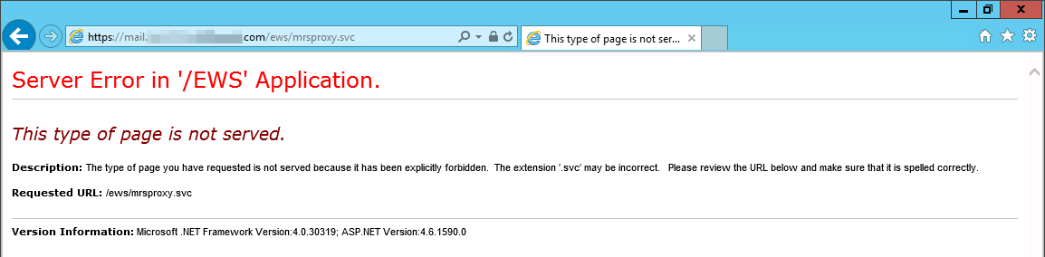 Going again to the URL https://mail.domain.com/EWS/mrsproxy.svc I now received the correct ”error code” of ”The webpage cannot be found” and 404.