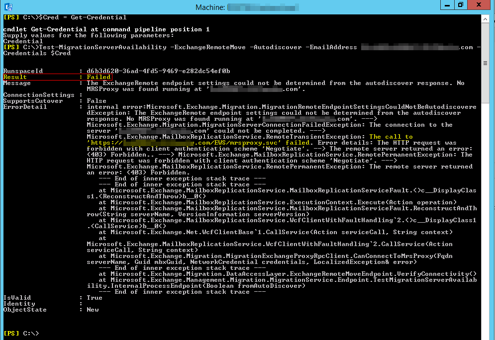 On the on-premise Exchange Server I ran the Test-MigrationServerAvailability command with the following parameters to verify the availability with migrating cross-forest: