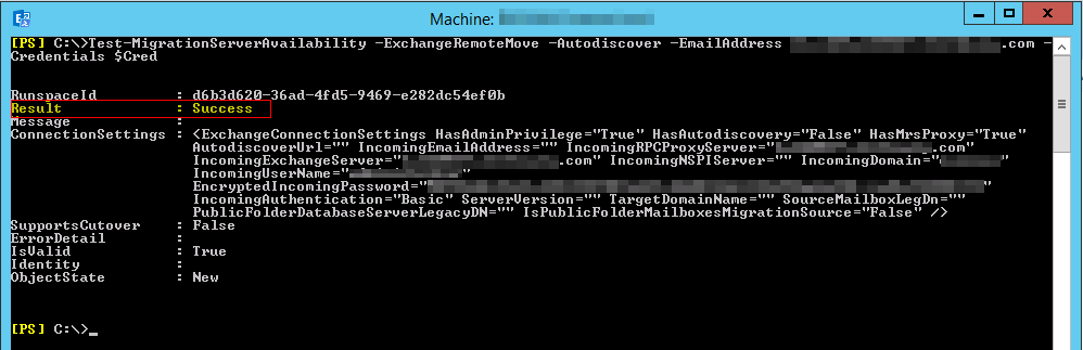 Rerunning the Test-MigrationServerAvailability command, I now received a Success as the result: