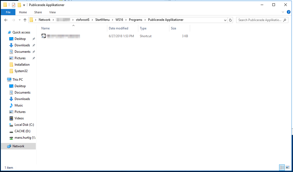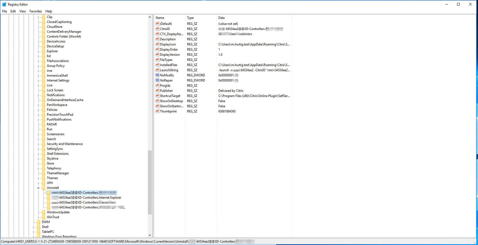 The next thing you will want to do is to log in with a test user. Citrix Receiver should now start for the user in the background and connect to the StoreFront. Log in as an administrator to the session host and browse to ”HKEY_USERS\{SID_FOR_TEST_USER}\Software\Microsoft\Windows\CurrentVersion\Uninstall”. You may now see all published applications as keys.