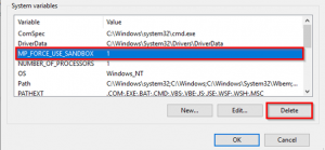 - Click on ’Environment Variables’, navigate to ’System Variables’ and remove ’MP_FORCE_USE_SANDBOX 1’.