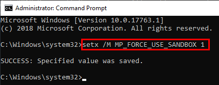 - Type: ’setx /M MP_FORCE_USE_SANDBOX 1’ and then press enter