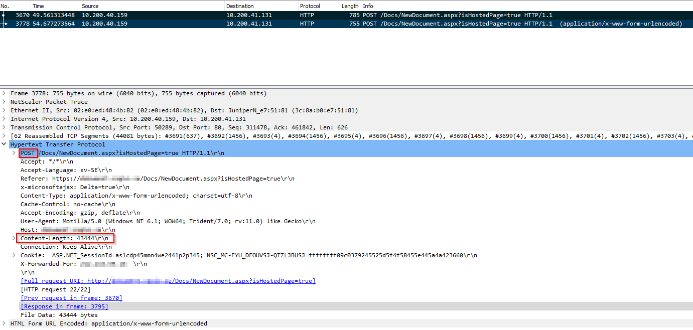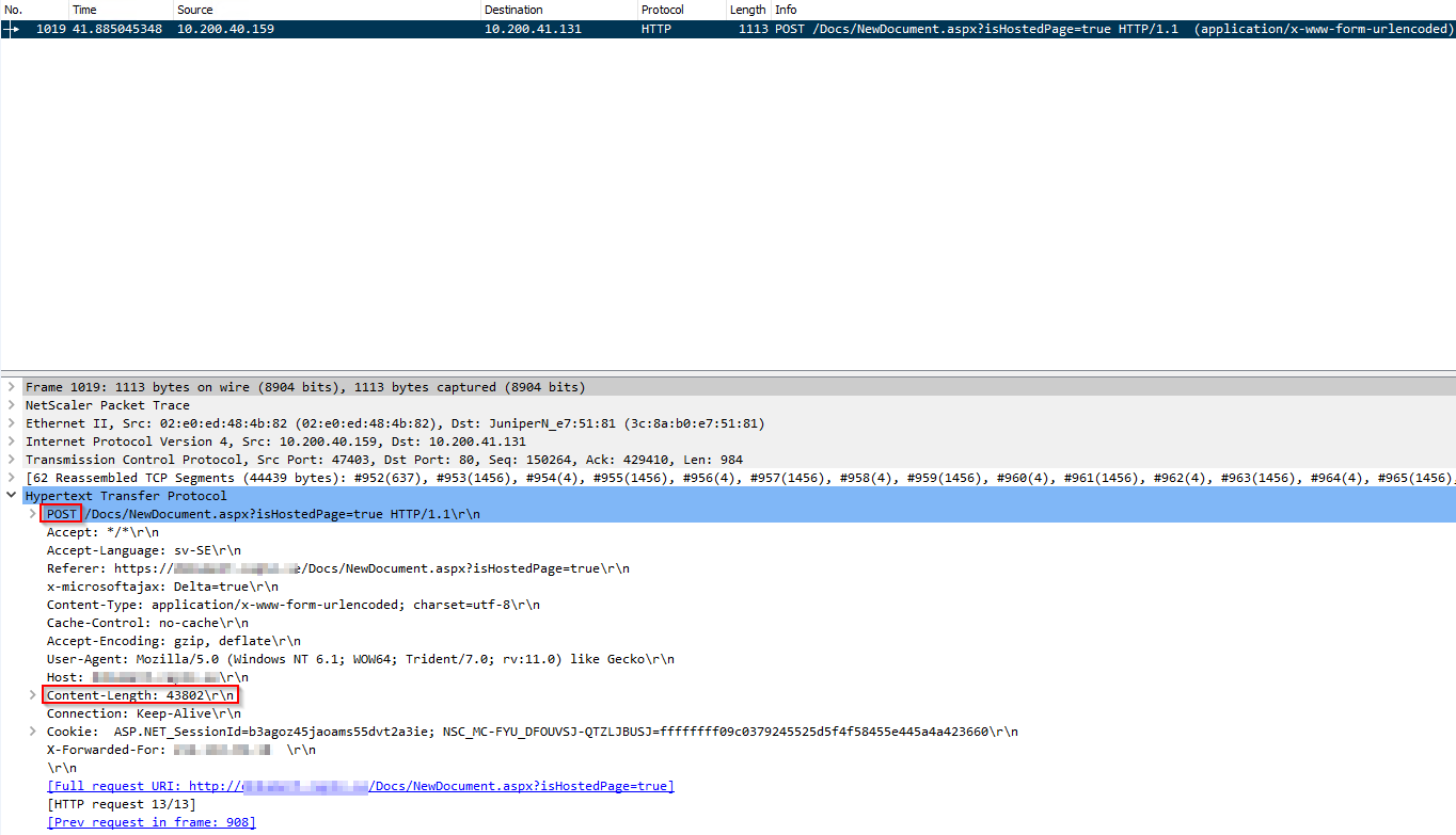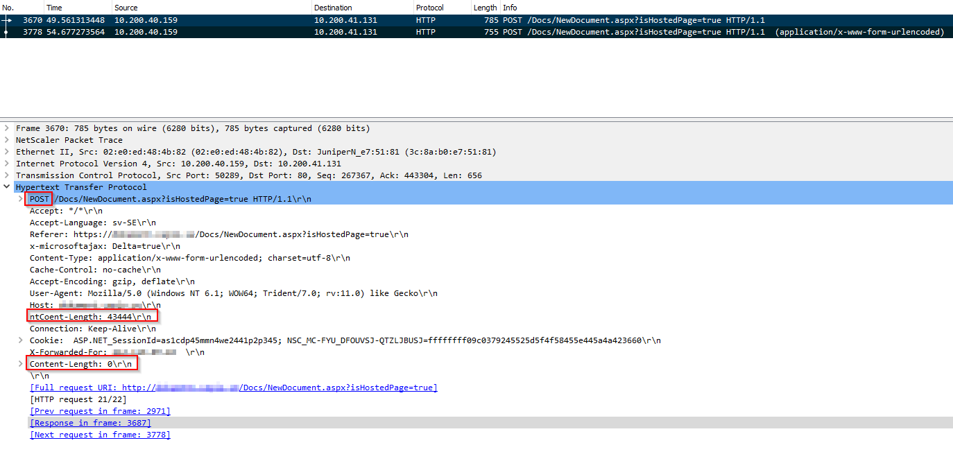 By default when AAA is activated on Netscaler, any large POST packet sent to the LB vServer, and subsequently to the backend, will be split up into two packets with the first one having a Content-Length header value of 0 and the secondary packet containing the correct Content-Length header value and the actual POST body. The backend code in this case is unable to handle the initial 0 length POST packet, and therefore crashes or bugs out before processing the second, real packet. See picture below of the WireShark capture showing the two packets.