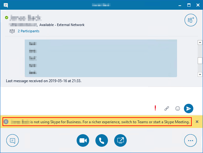 - Ben will also see in his Teams client that the external user is running SfB here: