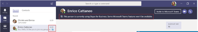 - One thing we have noticed, which is probably a bug, is that if an SfB users just opens a new chat to a Teams user it does not say the other user is a Teams user: