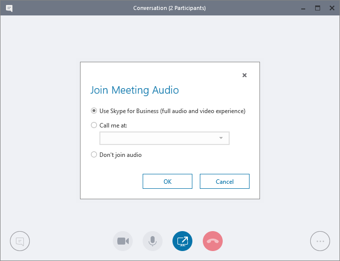 - If the SfB user clicks the Screen Sharing button, they will get a popup saying they need to start a meeting for that: