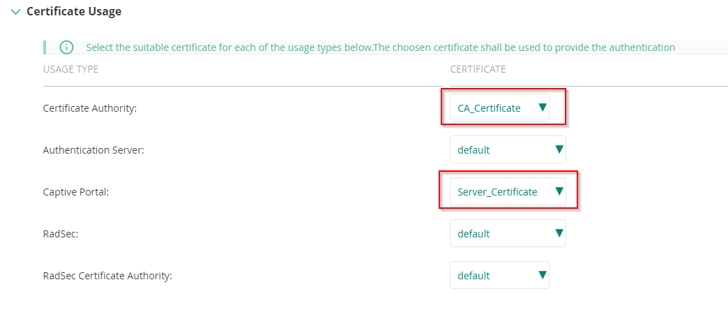 To bind the certificates to your Captive Portal go to Wireless Management (Choose the correct group you want to make the changes on) > Security > Certificate Usage. On Captive Portal – select your new Server Certificate and change the Certificate Authority to the CA certificate that you previously uploaded.