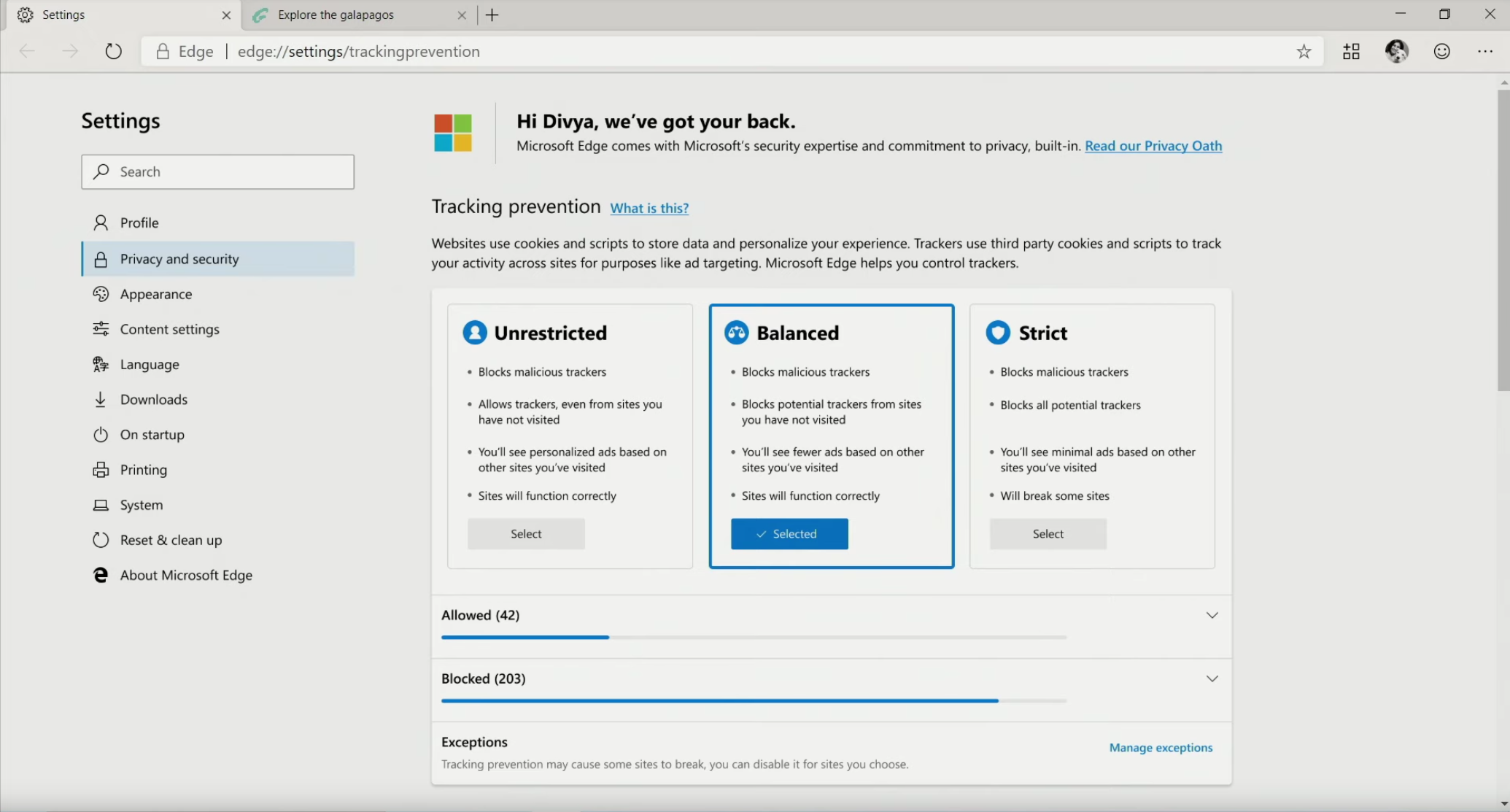 You will be able to select from one of three predefined privacy configurations. Unrestricted, balanced or strict. The strict mode blocks most trackers and trackers but sites might break. The unrestricted is the complete opposite, and the balanced mode is what we swedes say is lagom – not too much, not too little tracking.