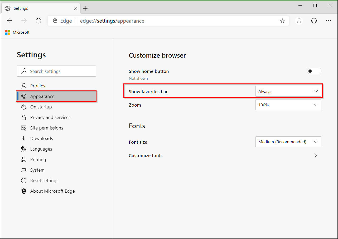 In this case I want to change so that the favorites bar always is showing as I use a lot of favorites.