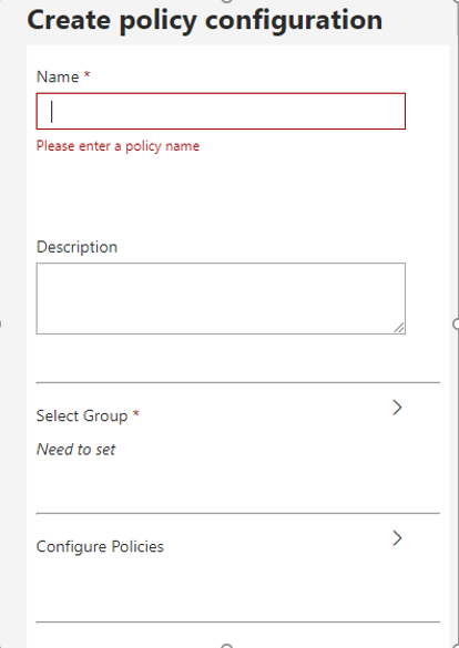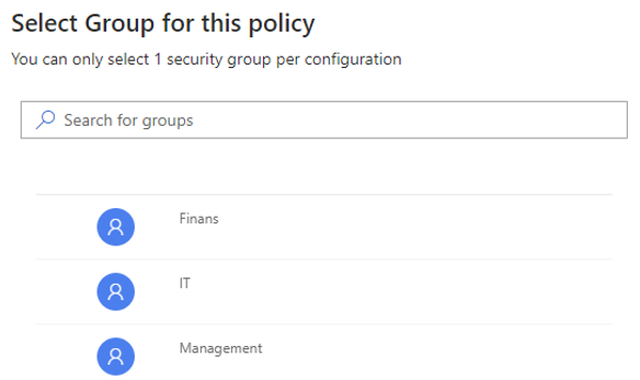 4: After you’ve specified a name for your policy you can go ahead and click the “Select group” button to be able to specify the group this policy will apply to. Note that you can search for specific groups in the search box, or just choose a group from the list. Note that you can only select one group per policy.