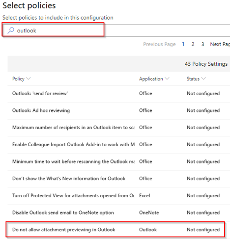 6: There is a search function to easily find the settings you are interested in. For example, I’ve searched for “Outlook” and I’m interested in preventing the attachment preview functionality, so I can click on the setting to start configuring it