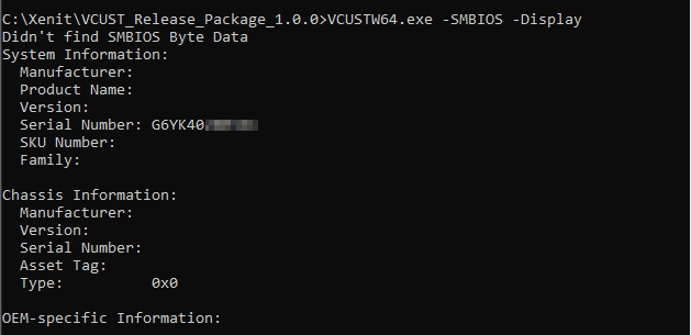 - Run “VSUT64exe -SMBIOS -Display” again to confirm the settings are changed.