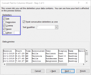 Tick the box for ”Comma”. You can see in the preview that the data looks correct. I chose ”Comma” and ”Space”. I wanted to make sure the date and time was separated as it means easier handling of the timestamp. Then press Next, then Finish.