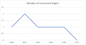 Data: Number of concurrent sessions per time Start Round up Time: Number: 06:17:22 06:15:00 06:00 1 06:34:55 06:30:00 06:15 2 06:59:22 07:00:00 06:30 1 06:45:20 06:45:00 06:45 1 06:07:13 06:00:00 07:00 1 06:22:03 06:15:00 07:15 0