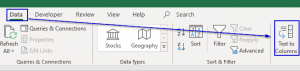 In order transfer the text to columns based on the commas. Press ”Text to columns”.