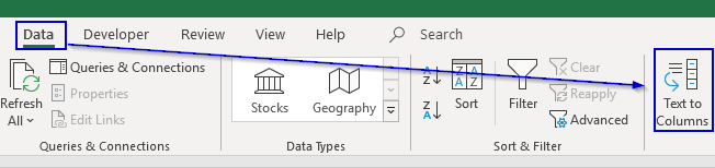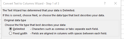 In order transfer the text to columns based on the commas. Press ”Text to columns”.