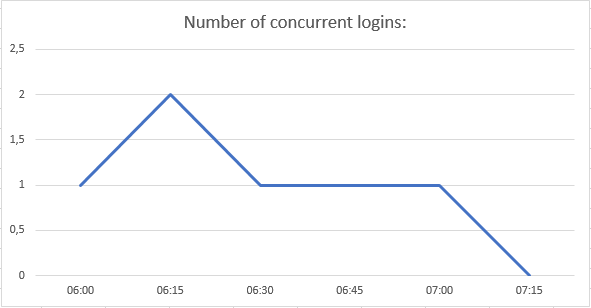 Data: Number of concurrent sessions per time Start Round up Time: Number: 06:17:22 06:15:00 06:00 1 06:34:55 06:30:00 06:15 2 06:59:22 07:00:00 06:30 1 06:45:20 06:45:00 06:45 1 06:07:13 06:00:00 07:00 1 06:22:03 06:15:00 07:15 0