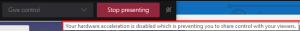 Your hardware acceleration is disabled which is preventing you to share control with your viewers.