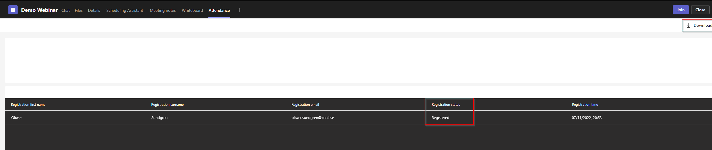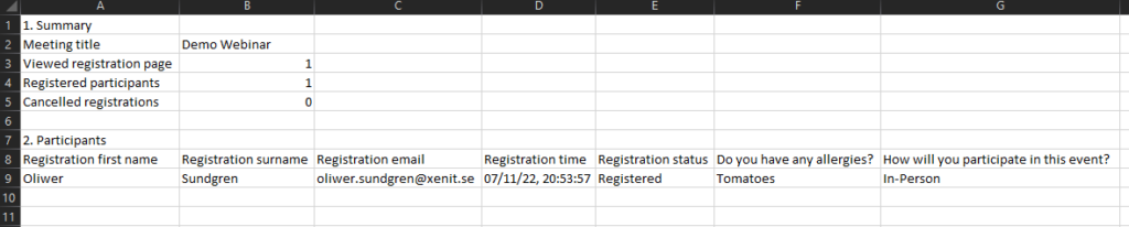 This will give us a overview of who has registered, and if any previously registered people have chosen to cancel. We can also click the “Download” button to get a better report, this will show us the custom fields we added to the form.