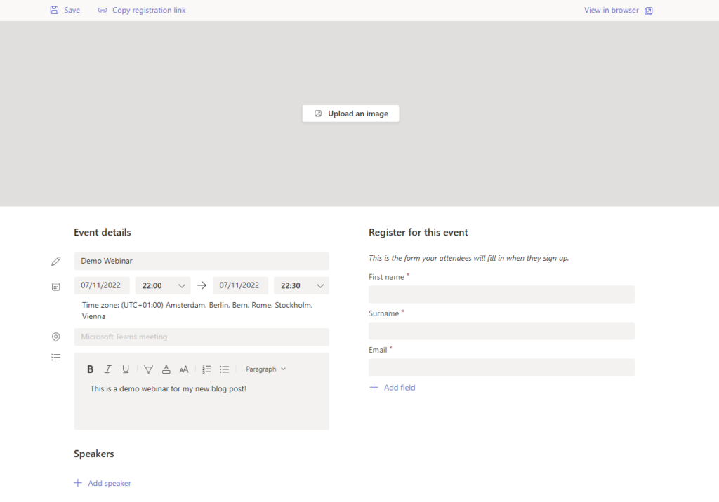 So as we can see, we can add a Title to the meeting, start/end time, image and a description.