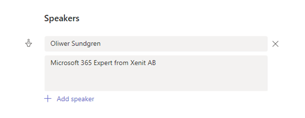 other than that we can also add Speakers, we would fill out a DisplayName and a Bio about the speaker like the example below