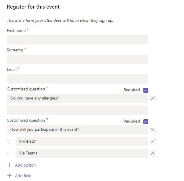 Once we’ve added our speakers it’s time to look over the registration form itself, what Information do we want attendees to provide? Maybe we are hosting a live webinar where snacks and drinks will be provided, then it could be good to be informed about allergies for example. And if they will participate online via Teams or physically on the event. We could then choose to add fields to the form. There are a few built in fields that are most common, but we could choose custom option and from there we could choose input or choice, we will do one of each to add the question about allergies and if people will participate in person or online.