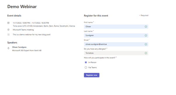 We also customized the registration form to give us information about the attendees allergies and if they would participate for the meeting in the office or via Teams.