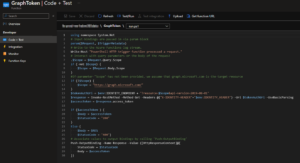 After setting the permissions, a function has to be created. I named mine ”GraphToken” which looks like the image below. In the right side of the options in the image you can also copy the URL which will be needed in Synapse Pipelines.