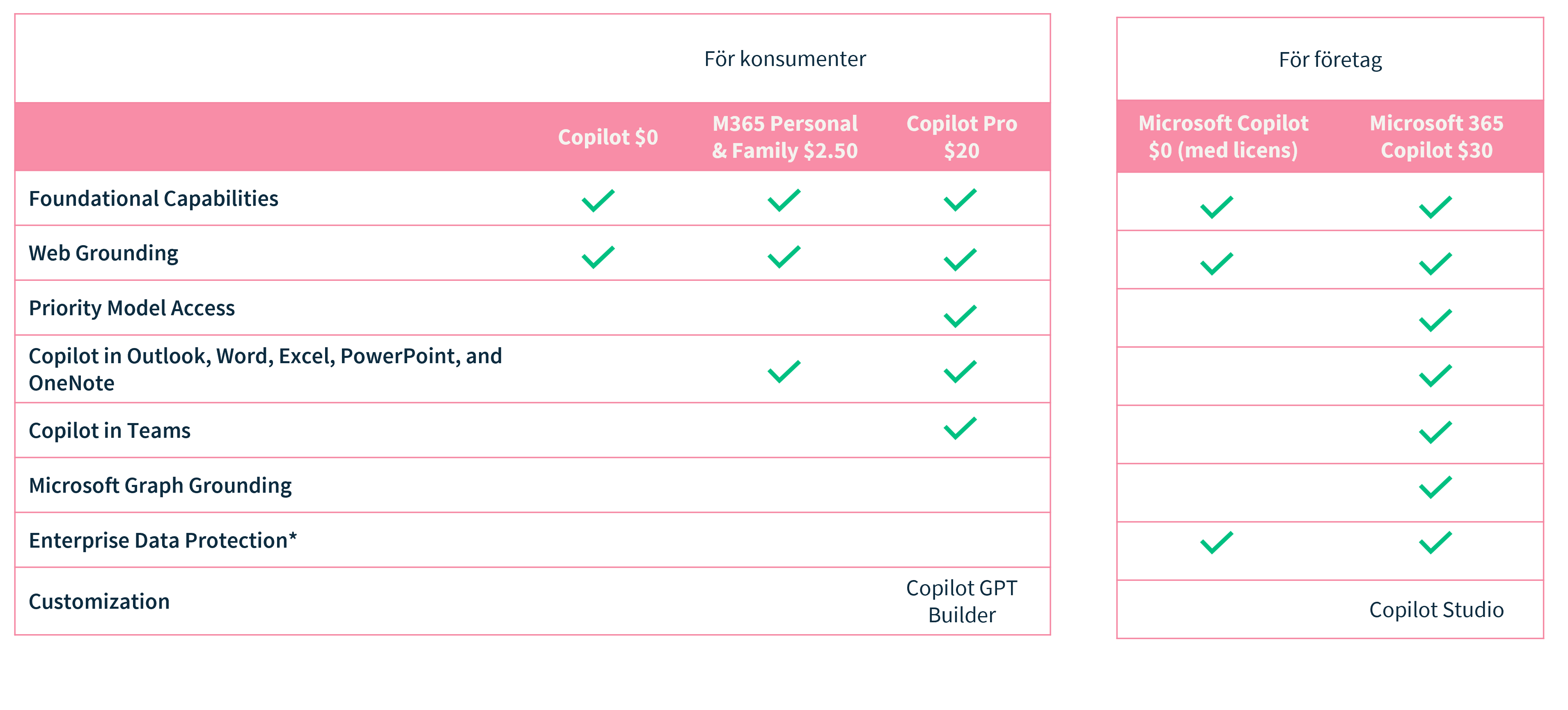 *Enterprise Data Protection innebär att all data är skyddad och används inte till att träna Copilot.